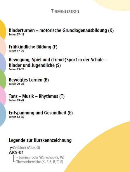 In diesen drei Tagen werden über 160 Seminare und Workshops zu Themen aus den Bereichen Bewegung, Spiel & Sport, Trendsport, Lebensräume und Bildungsorte für Kinder und Jugendliche, Ernährung, Bewegtes Lernen, Bildungschancen, Persönlichkeitsentwicklung und auch Inklusion angeboten.